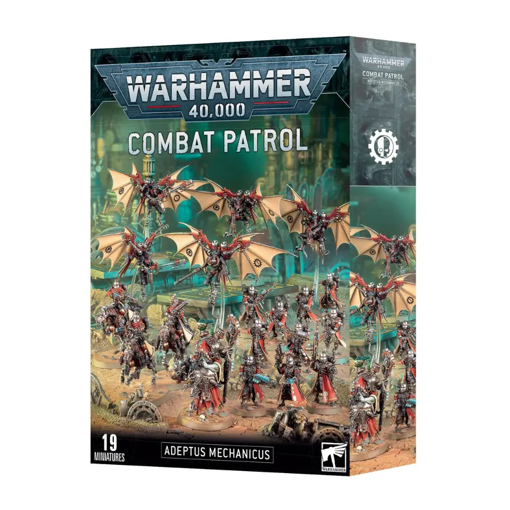 Warhammer 40,000 Adeptus Mechanicus Combat Patrol box featuring red-robed cyborg soldiers and winged fliers in a green industrial zone. Warhammer 40,000 Adeptus Mechanicus Combat Patrol box featuring red-robed cyborg soldiers and winged fliers in a green industrial zone.