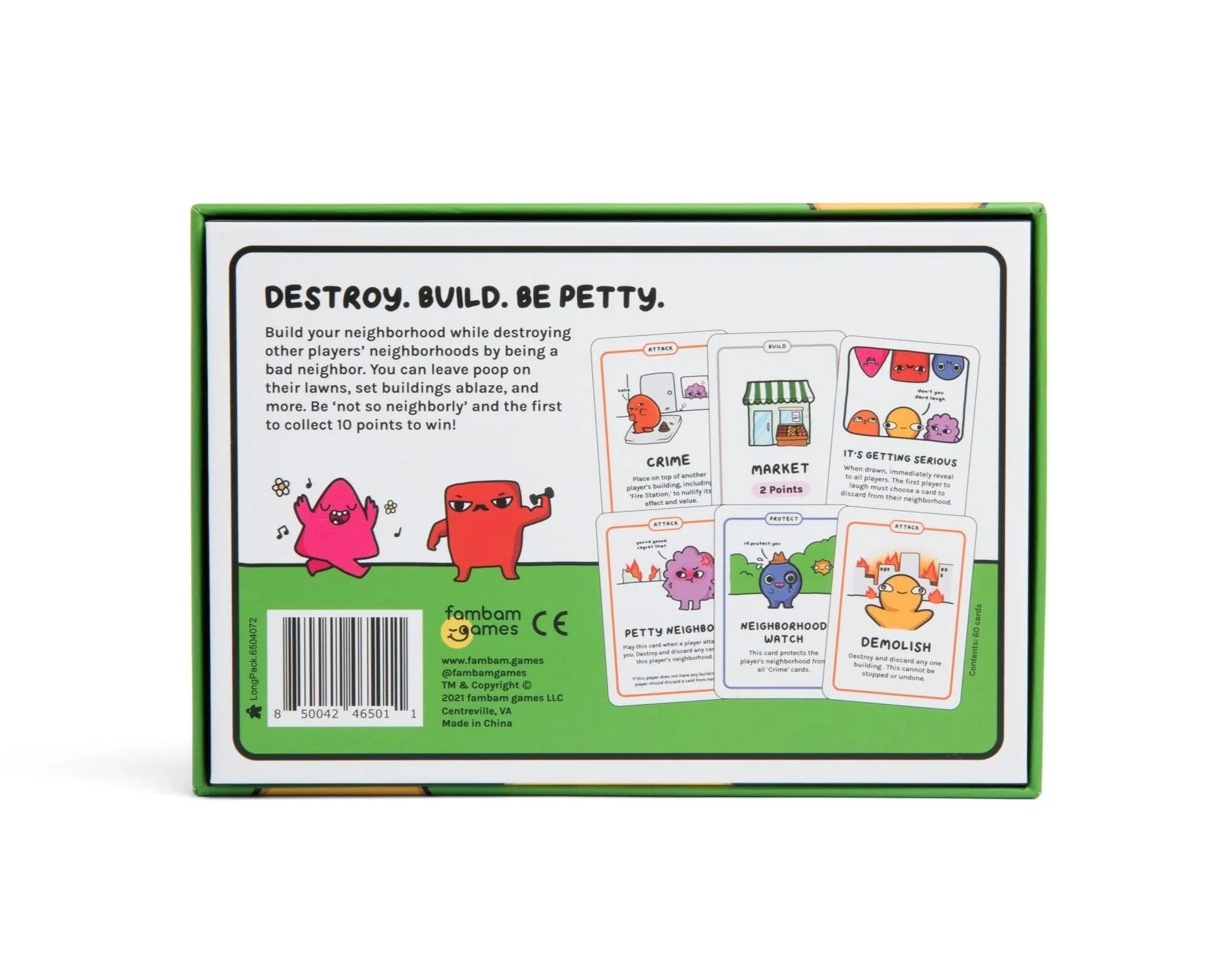 Not So Neighborly is a fun, family-friendly card game perfect for your next game night! In Not So Neighborly, your goal is to be the first to complete building a neighborhood by collecting a total of 10 build points. But, beware! The other players can prevent you from building your neighborhood by stealing buildings, destroying buildings, and more. So be not so neighborly in order to win.