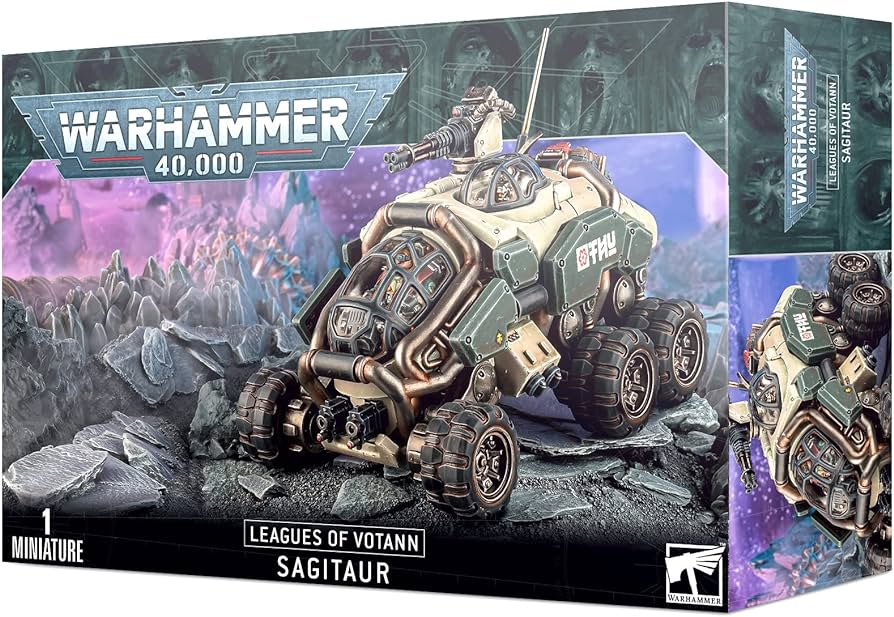 This box builds one Sagitaur, a fast-moving vehicle that combines firepower with the ability to carry a unit into battle. This sturdy six-wheeled vehicle boasts a hull-mounted twin bolt cannon, a rear transport hatch, and comes with a choice of four turret weapons operated by a robotic gunner – a HYLas beam cannon, L7 missile launcher, Sagitaur missile launcher, or MATR autocannon – providing the versatility to take on any threat. The Sagitaur's pilot is visible beneath a screen of clear plastic, with a choice of three different heads to customise your driver and keep each of your vehicles distinct.