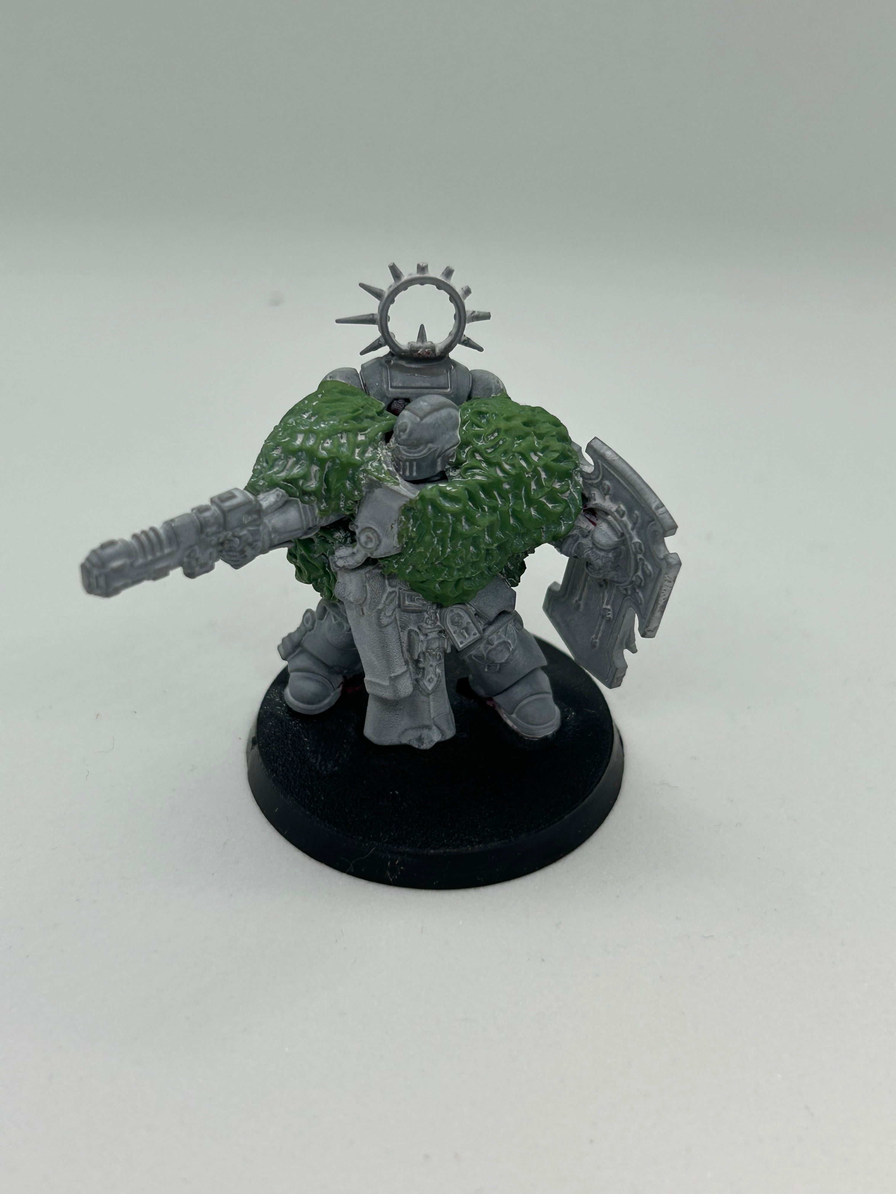Used pre-built model of a Lieutenant with Storm Shield with custom space wolves modification.