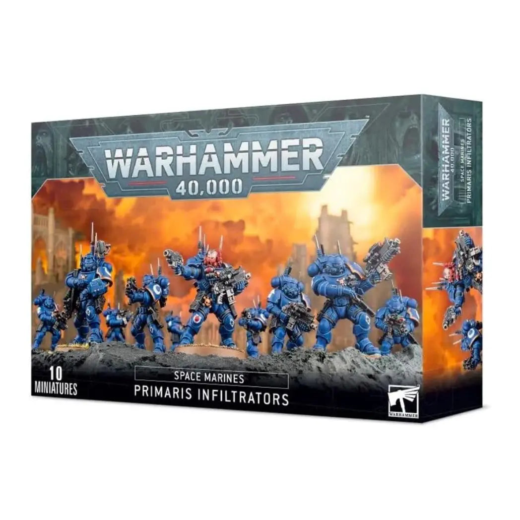 Warhammer 40,000 Space Marines Primaris Infiltrators box featuring 10 blue-armored Space Marines with marksman bolt carbines. Warhammer 40,000 Space Marines Primaris Infiltrators box featuring 10 blue-armored Space Marines with marksman bolt carbines.