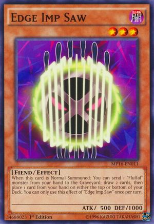 When this card is Normal Summoned: You can send 1 "Fluffal" monster from your hand to the Graveyard; draw 2 cards, then place 1 card from your hand on either the top or bottom of your Deck. You can only use this effect of "Edge Imp Saw" once per turn.
