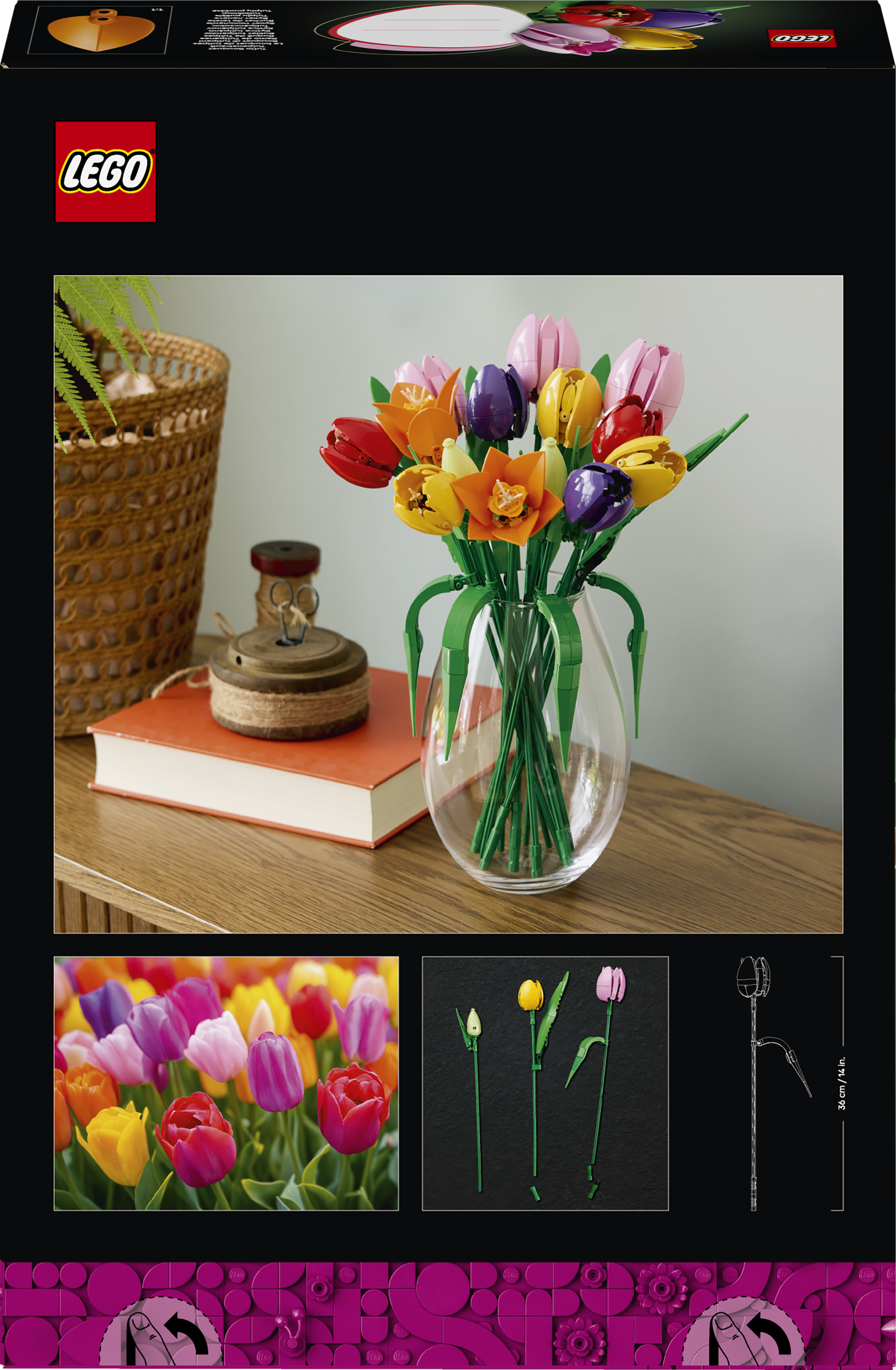 Add a gorgeous piece of flower decor to your home with the LEGO® Botanicals Tulip Bouquet (11501) building kit for adults. Capturing the joy and optimism of spring, this LEGO bouquet features 5 varieties of tulips in various colors and stages of bloom. Immerse yourself in the beauty of flowers as you craft green buds, purple closed tulips and red, yellow, pink and orange opened tulips, plus green leaves for added authenticity. The flower building set also includes adjustable stems that make it easy to arrange the tulips into a bespoke LEGO bouquet. Once you’ve completed this fun craft project, the set becomes a stunning piece of floral home decor that will bring color to any space. A thoughtful gift for women and men on birthdays, Valentine’s Day, Mother’s Day, housewarmings or any other special occasions, this flower building set is available in the LEGO Builder app, where budding florists can access digital building instructions and track their progress. Set contains 576 pieces.